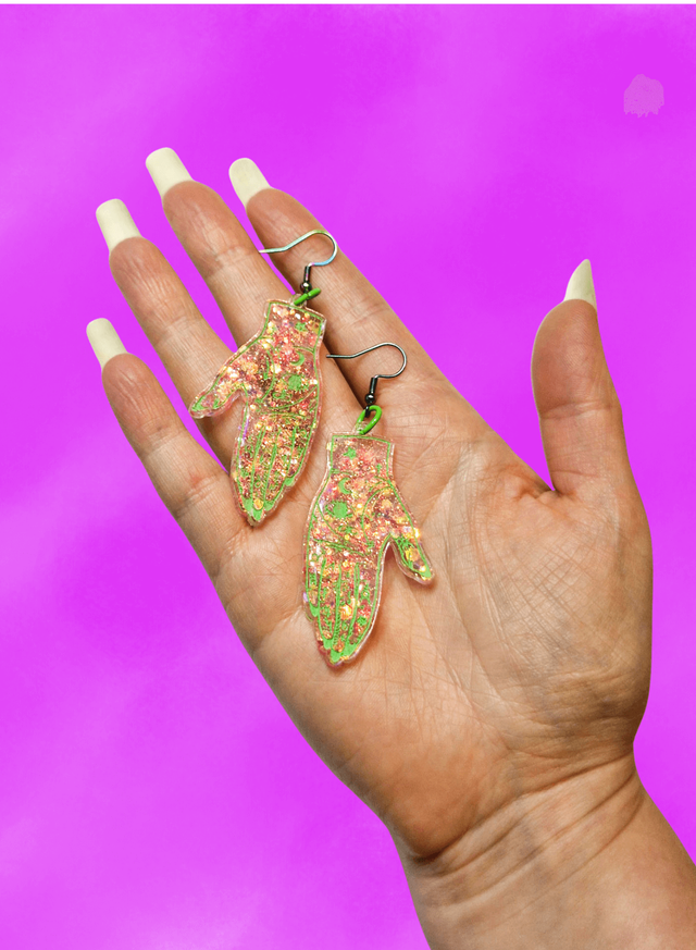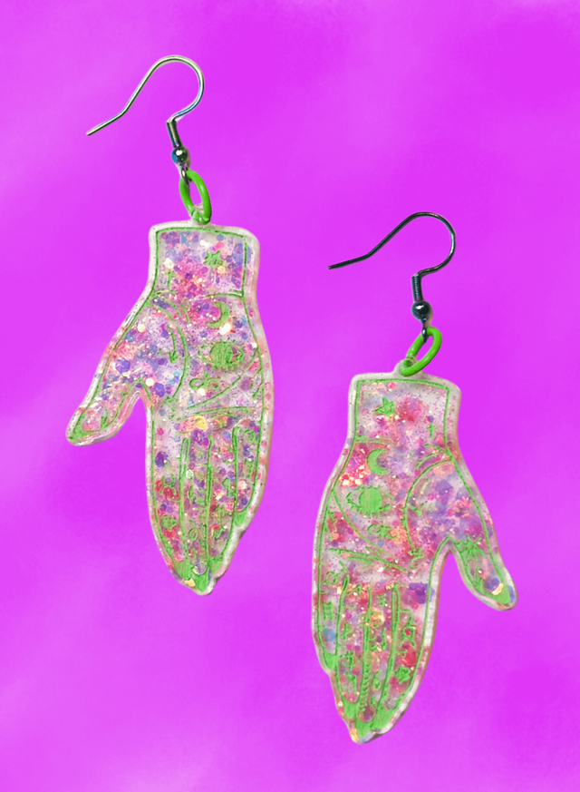 Astut huoneeseen ja jokainen katse tuntuu pysähtyvän käsiesi liikkeisiin. Läpikuultava hologrammiglitter hehkuu ja vihreät ääriviivat paljastavat jokaisen elämänviivan kuin salaisuuksia kertovan kartan. Näissä korvakoruissa on jotain samaa kuin ennustajan taidossa: ne vangitsevat huomion, saavat ihmiset kuiskimaan ja jättävät jäljen muistoihin. Olitpa sitten Halloweenin noita, mystikko tai omaehtoinen hullun kaunis näky, nämä kädet tekevät sinusta illan ennustetun kuningattaren.