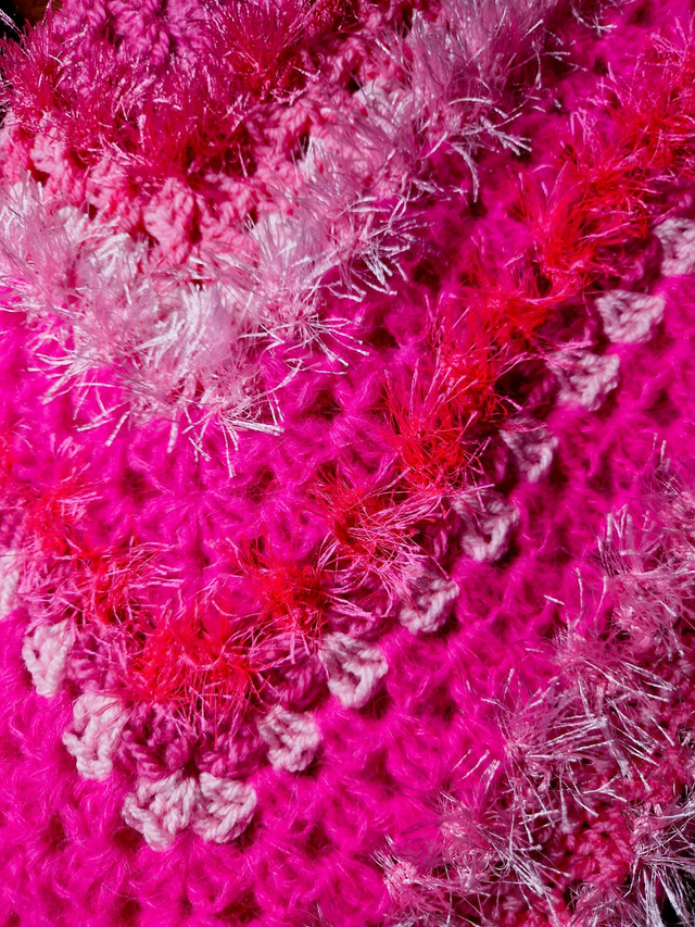 Käsin virkattu sekalaisista pinkeistä vintage- ja löytölangoista. Mukana mm. neonpinkkiä alpakkamerinomohairia, villaa, polyesterhapsulankaa sekä akryyliä.