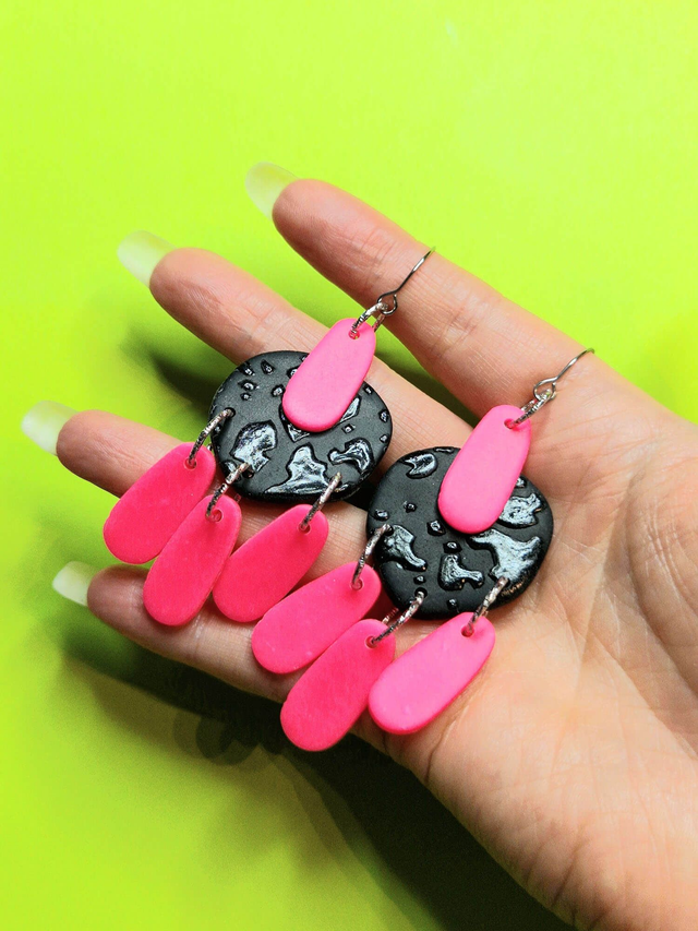 Materiaalit: Fimo-massa, lakka, korumetalli. Koukut kirurginterästä.