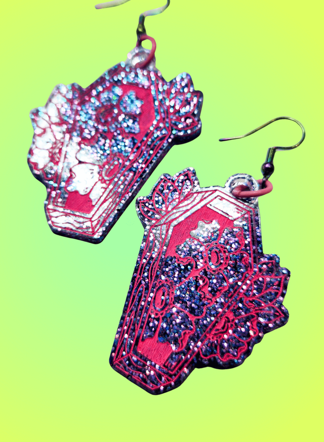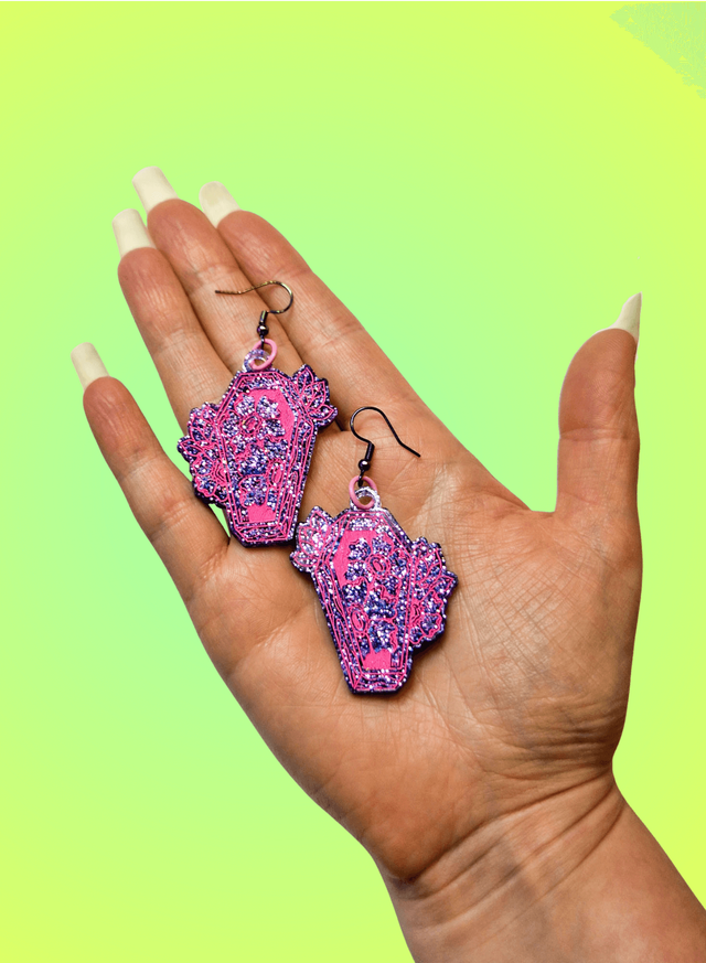 Näillä korvakoruilla olet kuin kukkiva arkkukuningatar keskellä juhlahumuja. Neonpinkit ääriviivat saavat kukkakuviot syttymään eloon, ja hologrammiglitteri hehkuu kuin salaperäinen valo. Täydelliset niille, jotka haluavat olla rohkeita, leikkisiä ja hiukan goottilaisen romanttisia Halloweenin yössä.