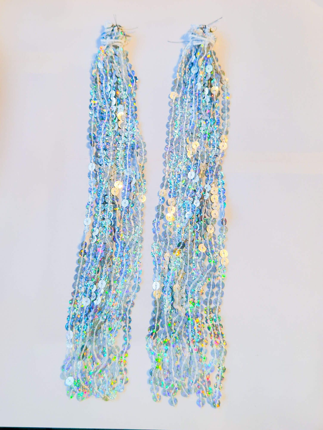 Hopea paljettitupsu ei ole mikään tavallinen tupsu: jokainen paljetti hehkuu sateenkaaren eri sävyissä, hologrammihipsut liikkuvat ja säihkyvät kevyesti. Yhdistä tämä tupsu valitsemaasi helmihattuun (Pitsi, Aalto, Raita tai Inka) ja luo oma uniikki statement-parisi. Korvakoukut kirurgin terästä, helmihatut hopeanväristä korumetallia.