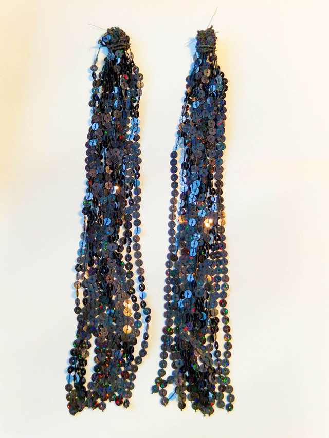 Musta paljettitupsu hehkuu sateenkaaren sävyissä hologrammihipsujen ansiosta. Yhdistä tämä tupsu Pitsi-, Aalto-, Raita- tai Inka-helmihatun kanssa ja tee tyylikäs statement-pari. Koukut kirurgin terästä, helmihatut hopeanväristä korumetallia.