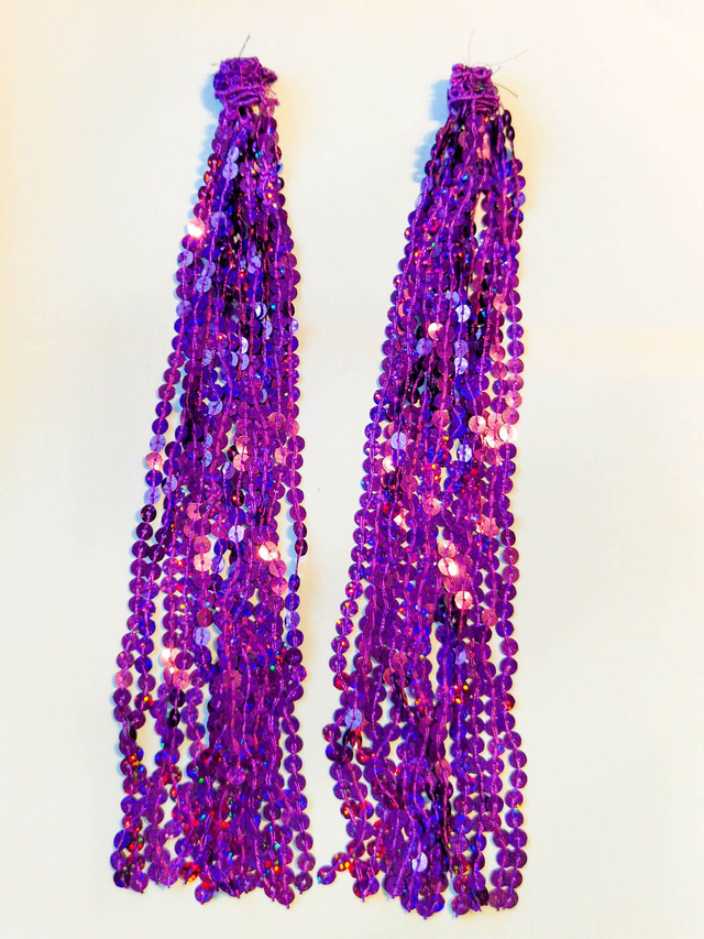 Purppurat paljetit hehkuvat hologrammihipsujen ansiosta sateenkaaren eri väreissä. Yhdistä tämä tupsu Pitsi-, Aalto-, Raita- tai Inka-helmihatun kanssa ja luo oma syvä ja näyttävä statement-pari. Koukut kirurgin terästä, helmihatut hopeanväristä korumetallia.