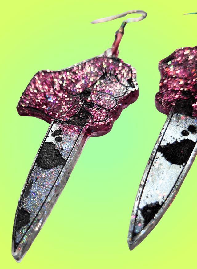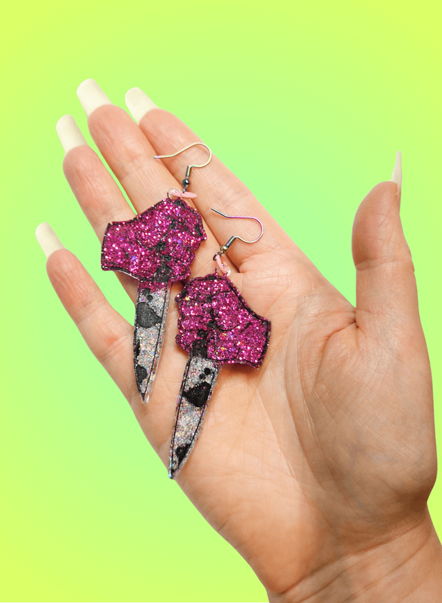 Kuvittele hetki, kun astut Halloween-juhliin ja kaikkien katseet kääntyvät sinuun. Näissä korvakoruissa pinkki hologrammikäsi puristaa hopeista veistä, eli aivan täydellinen yhdistelmä kauhua ja glitteriä. Nämä 8 cm pitkät veitseniskut roikkuvat kevyesti, mutta dramaattisesti, kuin suoraan psykoelokuvan ikonisesta kohtauksesta.