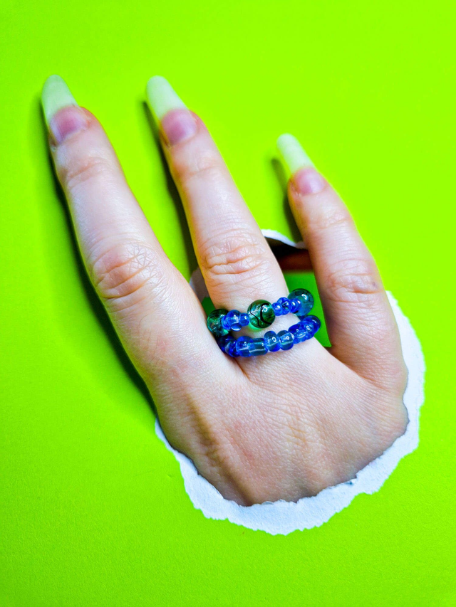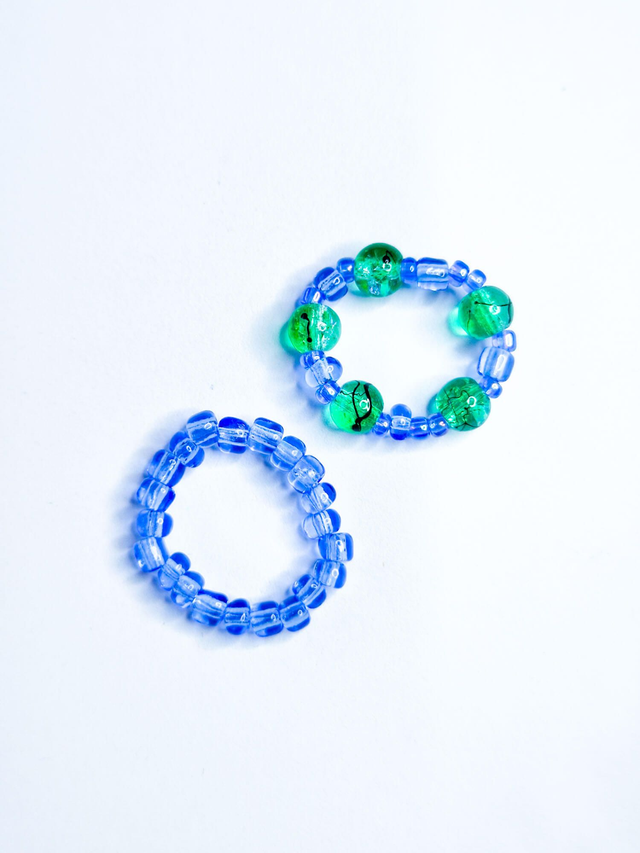Salaisuuksien Syvyys on sormussetti, joka kätkee sisäänsä enemmän kuin ensisilmäys antaa ymmärtää. Toisen sormuksen vedensininen kirkkaus on kuin kaunis valhe, joka lupaa rauhaa ja tyyneyttä. Sen rinnalla kulkevat minttuiset, krakleeratut helmet, jotka paljastavat pinnan alta säröjä: muistutuksen siitä, että mikään ei ole niin täydellistä kuin näyttää. Yhdessä ne luovat tarinan, jossa kirkkaus ja murtuma kulkevat käsi kädessä. Aivan kuten rakkaus ja tuska telenovelan sydäntäsärkevimmässä kohtauksessa.
