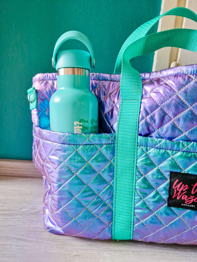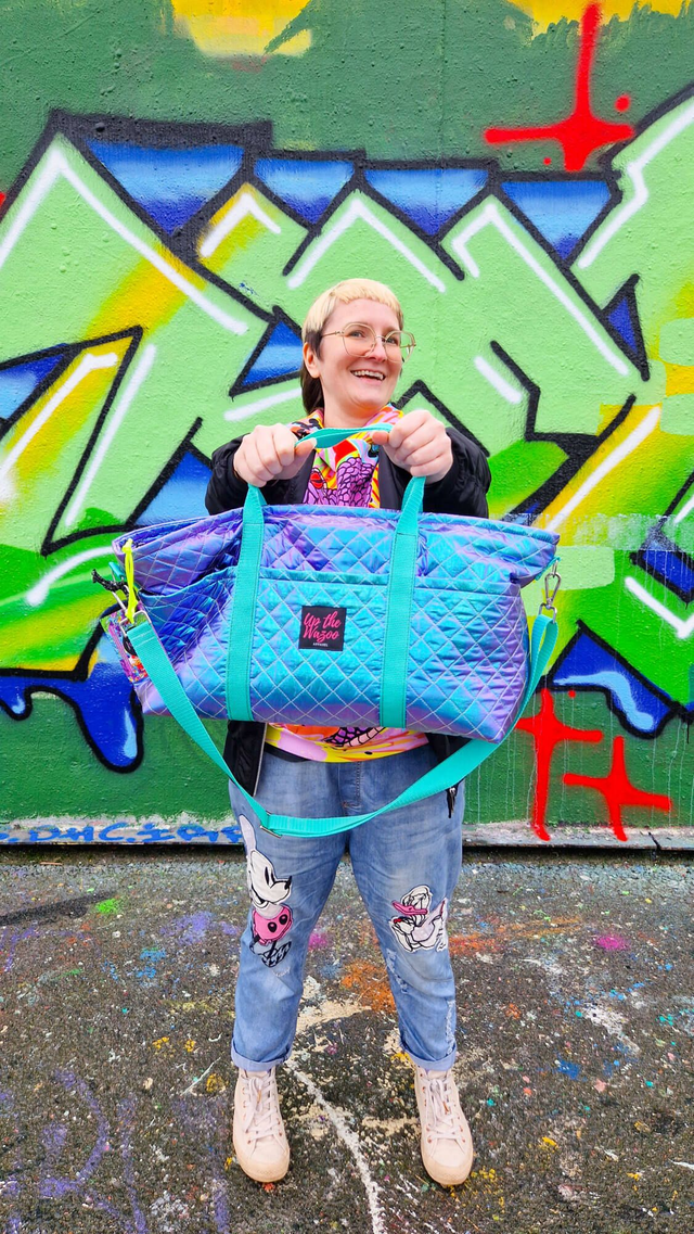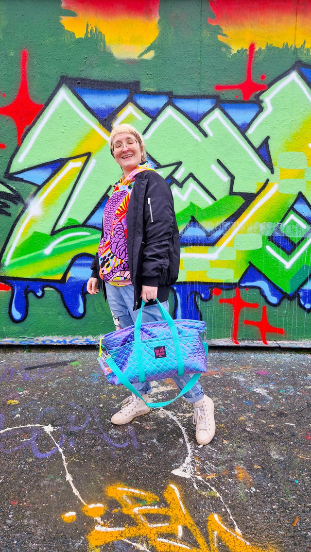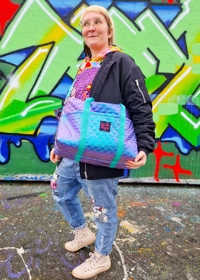Holografinen tikkikangas vaihtaa väriä turkoosista violettiin kuin maaginen valoilmiö. Mintunvihreät sangat kiertävät koko laukun ympäri ja kantavat sinut läpi viikonloppujen, seikkailujen ja pienimuotoisten elämänkriisien.