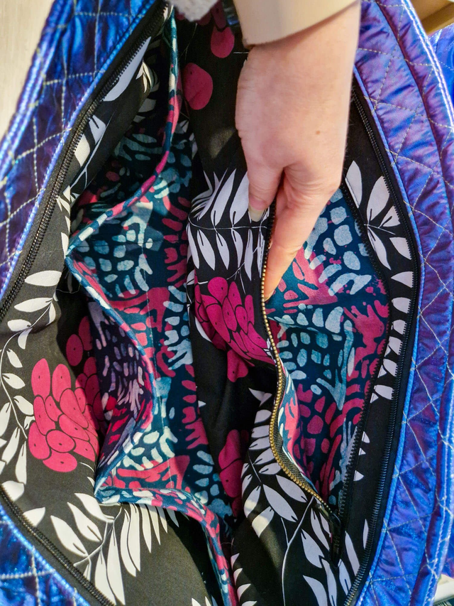 Tämä laukku pysyy ryhdissä kuin drag queen lavalla: kovan pohjan ja vetoketjusuljennan ansiosta mikään ei putoa eikä lysähdä. Vuorikangas on kierrätettyä puuvillaa vanhoista verhoista ja holografinen tikkikangas teollisuuden ylijäämää, joten myös planeetta kiittää.